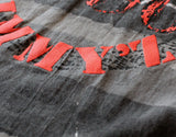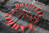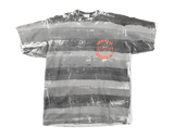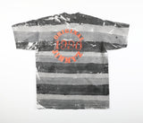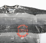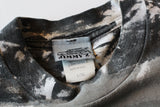 Vintage Jimmy Z tee featuring a classic 90s all-over print tonal grey painted texture. Print on front chest and back, both are a raised puff print ink. Bright orange color to the print.